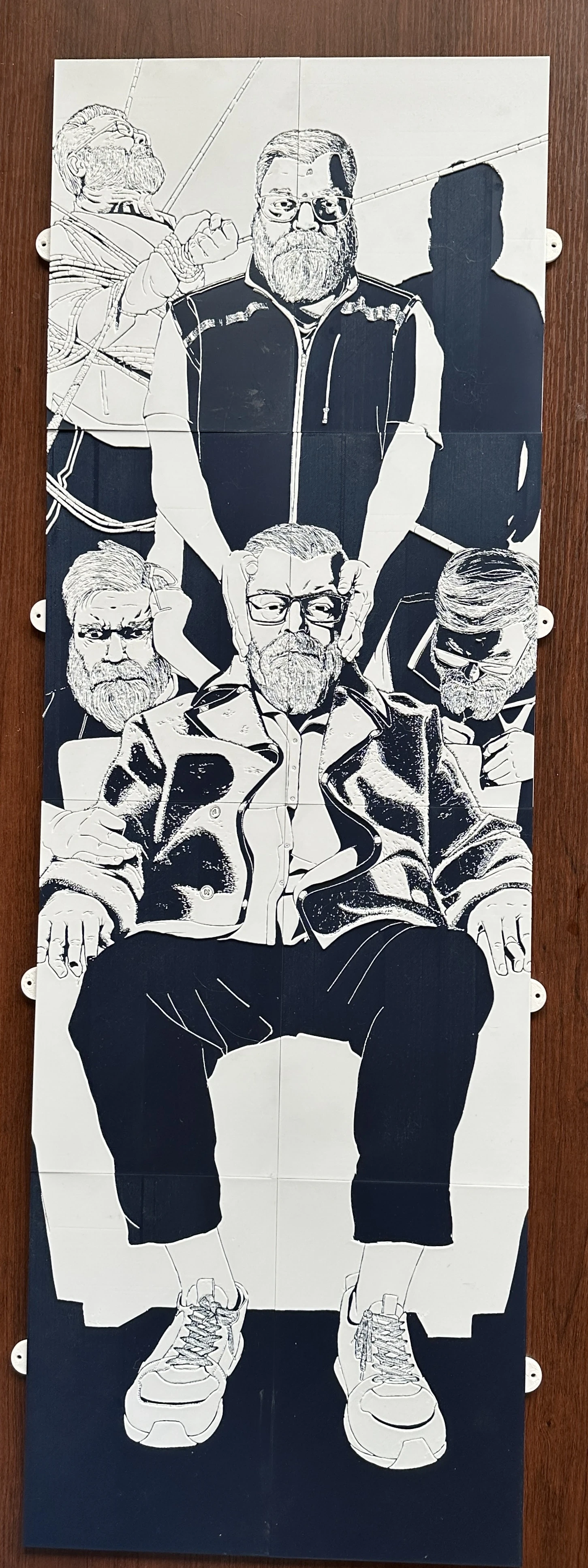 The artist sits in a chair with a felt coat, black pants, and running shoes. They have a beard, glasses and look straight forward. Five figures of the artist are behind them. The First is directly behind the artist with a stone face. Their hands cover the artist’s ears and keep him looking forward. Crouching to the right of the artist is a sinister looking figure. Its face in shadow as it whispers to the artist. To the left is a figure with a Worried look. It leans its head on its balled fist while its right hand grasps the sleave of the artist coat. Behind these figures a bound man struggles to get free and the silhouette of the final figure